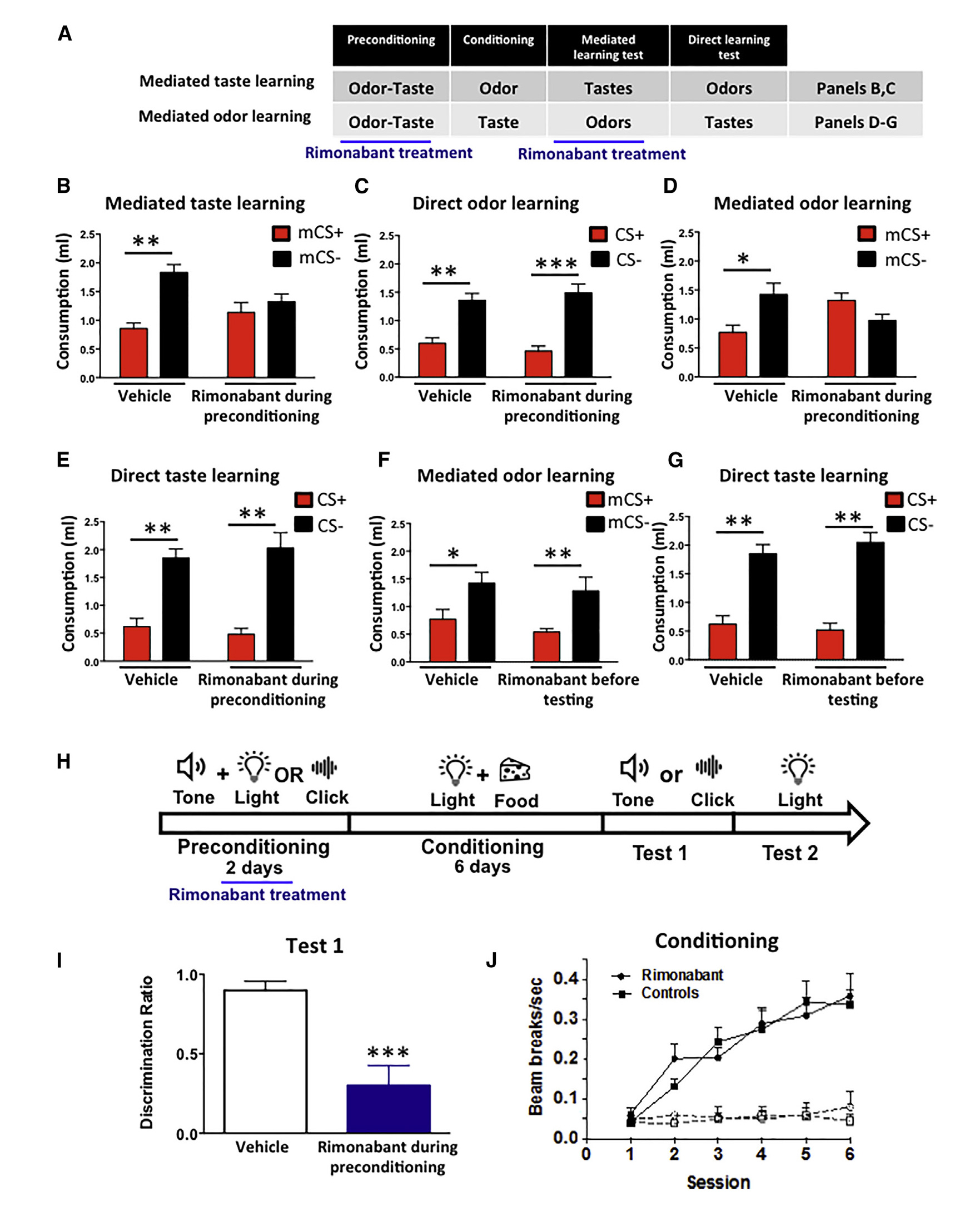 此外,在测试前使用Rimonabant对气味或味道厌恶没有影响(图2F-G),这表明CB1R激活是此类联想型的记忆形成所必需的。接下来,作者进一步探究CB1R激活在其他感觉刺激(视觉和听觉)以及非条件刺激(食物奖励)是否发挥同样的作用(图2H),结果与上述一致(图2I-J),提示介导学习依赖于CB1R在联想记忆形成过程中的激活,且不局限特定的感觉刺激或非条件刺激。