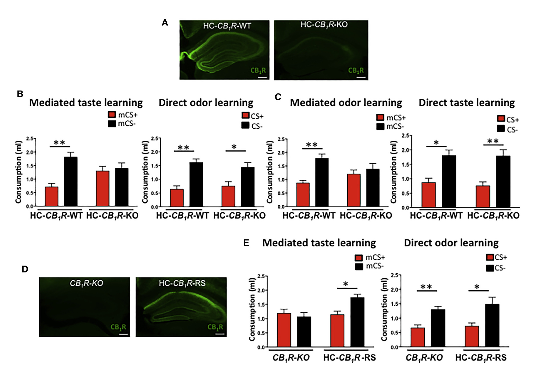 通过感觉预条件刺激实验(图1A),作者观察到野生型小鼠经CS (条件刺激)或mCS (介导性条件刺激)均消耗较低的味道或气味量,这表明野生型小鼠已形成明显的介导性厌恶学习和直接厌恶学习。有趣的是,CB1R敲除小鼠(CB1R-KO)经CS 表现出直接学习能力,但mCS 作用不明显(图1B-E),这表明CB1R是介导学习的必要因素。