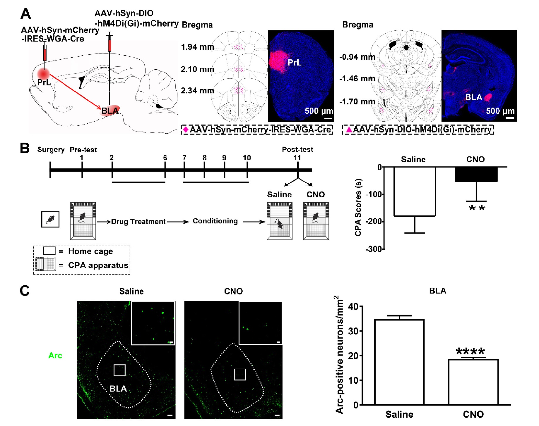 同时,作者借助化学遗传学方法进一步验证,在吗啡戒断小鼠BLA注射AAV-hSyn-DIO-hM4Di(Gi)-mCherry病毒,在PrL注射AAV-hSyn-mCherry-IRES-WGA-Cre病毒(图3A),CPA测试发现,CNO药物抑制组小鼠对戒断场景未表现出明显的厌恶动机(图3B,C),这进一步表明激活BLA-PrL神经环路,在戒断场景对成瘾记忆重提过程中的重要作用。