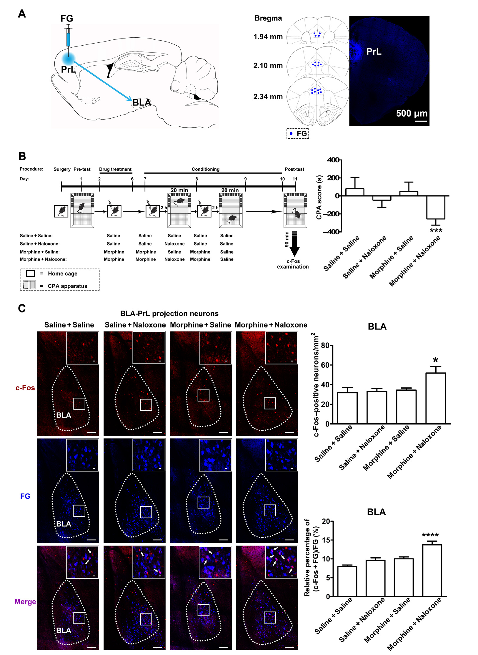 首先,作者在边缘前皮质(PrL)注射荧光金(FG)逆向标记BLA-PrL投射神经元(图1A),随后通过条件性位置厌恶(CPA)行为学范式[4]发现,吗啡与纳洛酮匹配组小鼠表现出对戒断场景有明显的厌恶动机(图1B),同时,BLA中c-Fos的表达水平及FG和c-Fos的共表达水平均显著增加(图1C)。这一结果提示了,戒断场景能更大程度地激活吗啡戒断小鼠投射到PrL的BLA神经元。