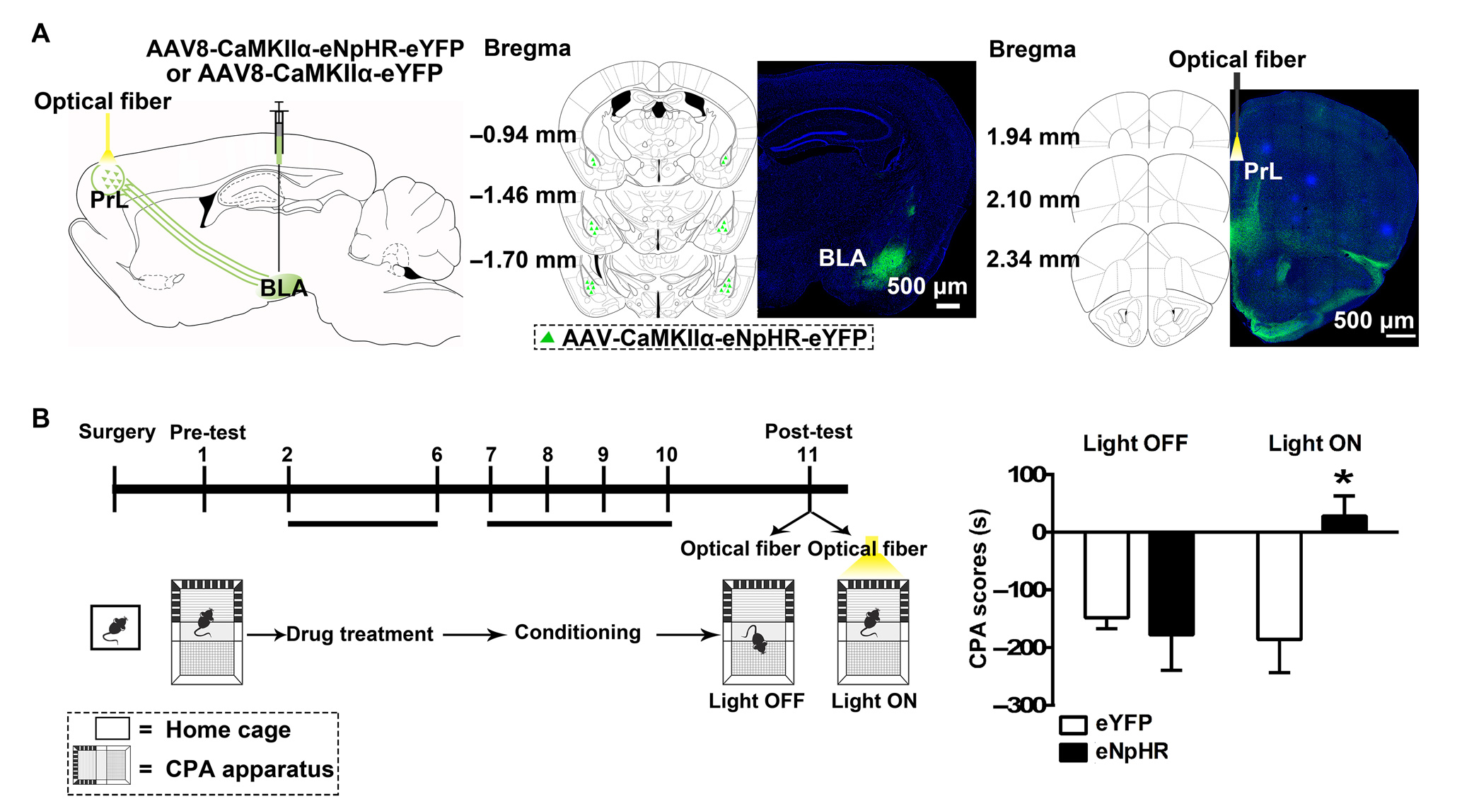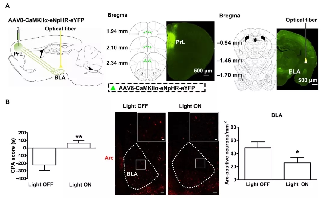 接下来,作者在小鼠的BLA中注射AAV8-CaMKⅡα-eNpHR-eYFP,在PrL埋植光纤(图2A),发现在CPA测试期光抑制BLA-PrL神经环路可以明显抑制戒断场景对成瘾记忆的激活(图2B)。