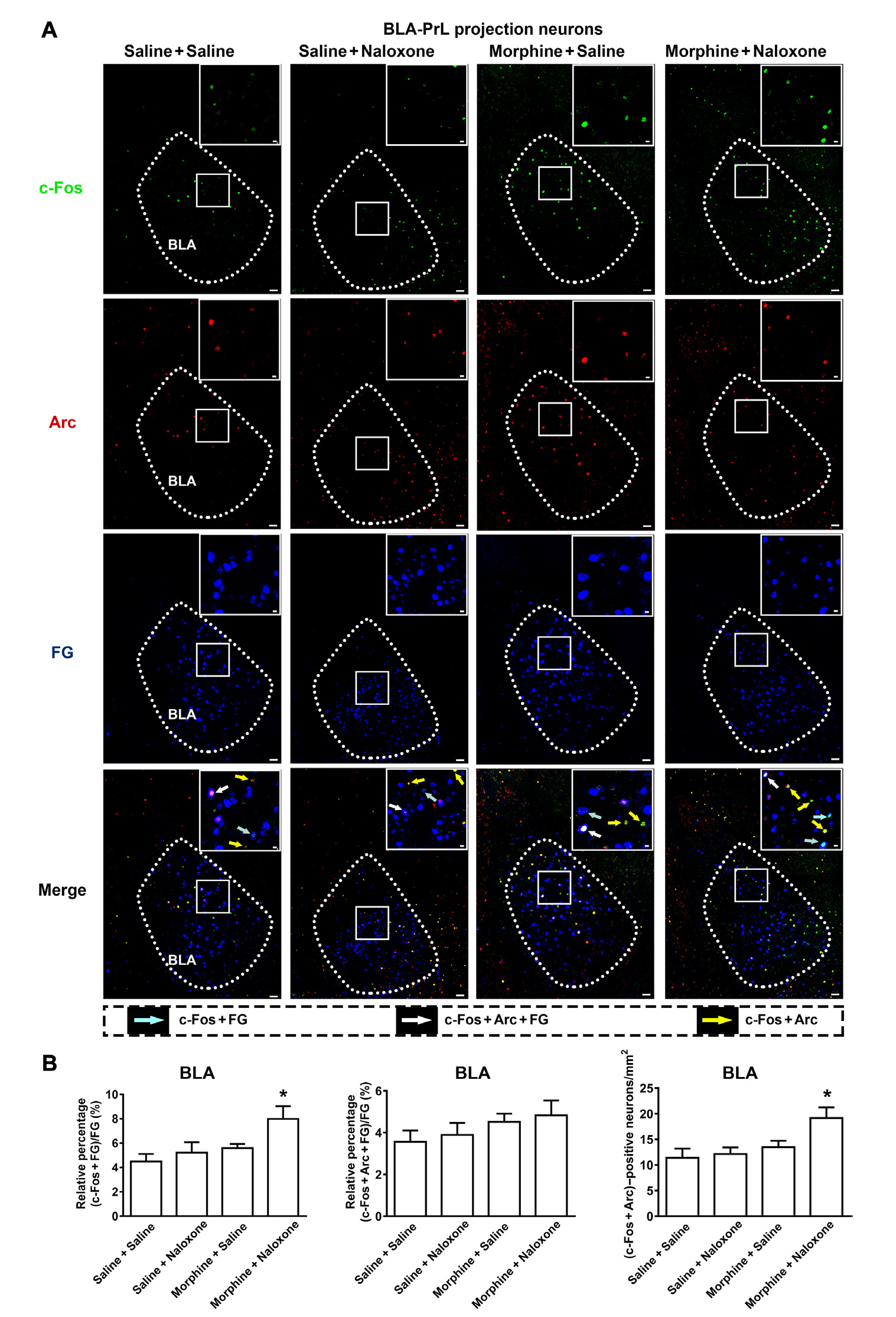 随后,作者探究了在戒断场景中吗啡戒断小鼠投射到PrL的BLA神经元可塑性的变化。同样地,他们在PrL注射FG逆向标记BLA-PrL投射神经元。在CPA行为学范式后,他们发现,吗啡与纳洛酮匹配组小鼠BLA中Arc蛋白[5]表达水平明显升高,然而FG标记的神经元中Arc表达水平与其他组小鼠相比并没有明显区别(图4),提示了戒断场景并未明显改变吗啡戒断小鼠投射到PrL的BLA神经元可塑性变化。