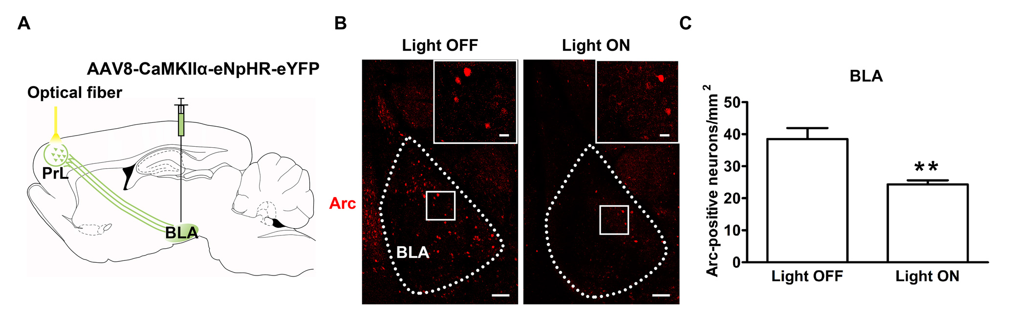 上述结果表明,BLA-PrL神经环路激活后,仅仅是将信息输送到前额叶皮层,并没有记忆信号的提取,因此,作者推测BLA投射神经元投射到PrL后,会引起PrL通过其投射神经元再将信息反馈到BLA,以激活BLA另一群神经元中Arc蛋白表达水平的增加。为验证这一猜测,他们借助AAV病毒载体,配合光遗传学方法(图6A)发现,光抑制BLA-PrL神经环路明显抑制戒断场景对Arc的激活(图6B,C)。