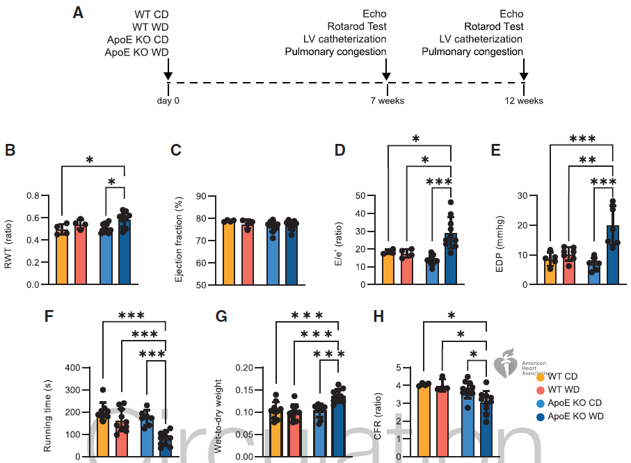 ApoE KO WD(西方饮食)小鼠是一种常用的动脉粥样硬化模型,且表现出与HFpEF相关的并发症,如代谢功能障碍等,因此研究了ApoE KO小鼠喂食WD是否会发生HFpEF(图1A)。ApoE KO小鼠逐渐出现心肌重构(图1B)。在喂养 WD 7 周和 12 周后,ApoE KO WD 小鼠的舒张功能受损,舒张压显著升高,肺重量显著增加(图 1D-G)。此外,ApoE KO WD小鼠的冠状动脉血流储备减少,表明小鼠的内皮功能受损(图1H)。这些结果表明:喂食 WD 的ApoE KO 小鼠表现出HFpEF特定表型。
