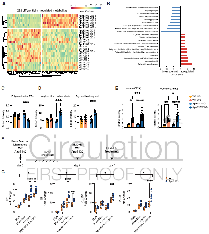 在受调控的代谢产物中,长链饱和脂肪酸laurate (C12)和myristate (C14) 在ApoE KO-WD 小鼠左心室中的含量增加(图 4E)。为了测试这些饱和脂肪酸是否能促进巨噬细胞的促炎性活化,从 WT和ApoE KO 小鼠的骨髓中获取了巨噬细胞,并将其暴露于单独的月桂酸酯、单独的肉豆蔻酸酯或两种脂肪酸组合中(图 4F)。值得注意的是,ApoE KO的骨髓衍生巨噬细胞在暴露于脂肪酸后,Tnf、Il6、Cxcl10 和 Cxcl2 的表达明显增加(图 4G)。揭示了代谢应激驱动巨噬细胞活化的细胞基础,表明局部心脏环境的变化可使巨噬细胞向炎症表型倾斜。