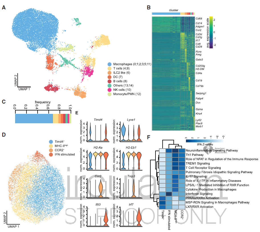 为了分析 HFpEF的炎症特征,对心脏 CD45+ 分选细胞进行了 scRNA-seq 分析。确定了7种主要免疫细胞类型,包括巨噬细胞、T 细胞、ILC2 like、DC、B 细胞、NK细胞、单核细胞/PMN等(图 2A-C)。鉴于巨噬细胞的高丰度和已知的促进舒张功能障碍的作用,对这一免疫群体特征进行详细描述。巨噬细胞共分为4个亚群,包括TIM4+(高表达Timd4和Lyve1)、MHC IIhigh(高表达H2-Aa 和 H2-Eb1)、CCR2+(高表达Ccr2 和 Tnip3) 和 IFN stimulated(高表达Ifit3和Irf7)(图 2D-E)。为了确定不同巨噬细胞亚群的特定功能,进行了IPA富集分析。Timd4+巨噬细胞富集了具有抗炎特性的核受体信号通路;MHC II和 CCR2+巨噬细胞富集了促炎通路;干扰素信号与IFN stimulated巨噬细胞独特相关(图 2F)。总之,证实了小鼠心脏中存在常驻(促进修复)和招募(促进炎症)的心脏驻留的巨噬细胞。