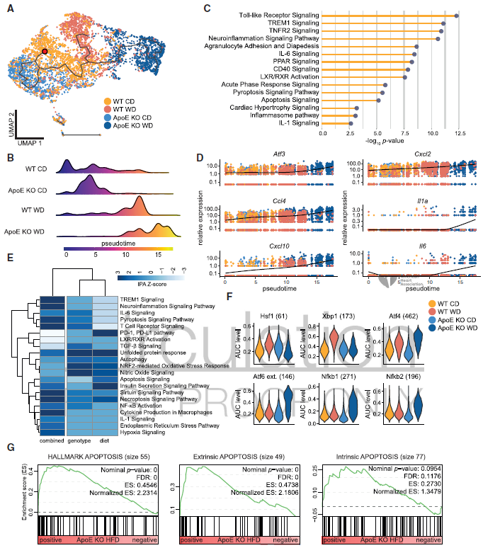 SCENIC 分析发现了一个 HFpEF 条件下特有的细胞群。虽然基因型和饮食单独会导致各自的TFs被激活,但两者结合会增加更多TFs的活性(图 3F)。基因富集分析证实,在 HFpEF 条件下,细胞凋亡的内在和外在通路被特异性激活(图 3G)。