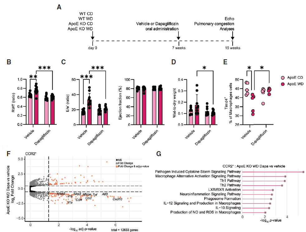 达格列净(钠-葡萄糖转运体2抑制剂,SGLT2i)是最有希望治疗心房颤动的一类新型药物,可通过使巨噬细胞极化为抗炎状态。为测试 SGLT2i是否能改善心脏免疫浸润状况,对喂食 WD 7 周并出现舒张功能障碍的ApoE KO 小鼠随机接受 SGLT2i或药物治疗 8 周(图 6A)。达格列净改善了心脏肥大和舒张功能障碍,并减轻了肺充血(图 6B-D)。值得注意的是,SGLT2i治疗诱导了Timd4+巨噬细胞丰度的完全恢复(图6E)。