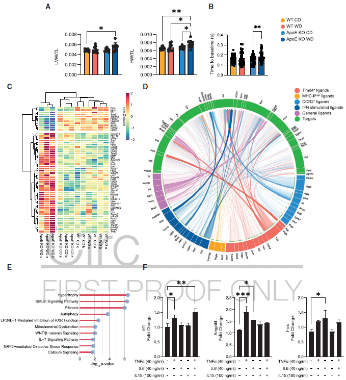 ApoE KO WD小鼠表现出明显的心脏肥大,心肌细胞受损(图5A-B)。巨噬细胞和心肌细胞之间的直接串联与包括代谢性心肌病在内的多种病理情况下的心脏重塑有关。活化的巨噬细胞释放的细胞因子和趋化因子可导致肥大、细胞死亡和左心室功能障碍等有害影响。为此,从小鼠心脏中分离出心肌细胞进行了RNA seq分析。在心肌细胞中发现的 356 个受显著调控的基因中,预测这些基因是巨噬细胞分泌的配体的靶标(图 5C 和 5D)。发现巨噬细胞-心肌细胞通讯轴上的靶标主要富集于几种心脏应激通路,如肥厚、纤维化、自噬和 WNT/β-catenin 信号转导(图 5E)。
