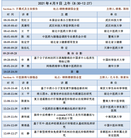 为了促进中医药与脑科学研究的发展,由中国生理学会中医药与脑稳态调控专业委员会主办的“2021年第三届中医药脑科学大会与认知障碍新进展高峰论坛”将于2021年4月8日至10日在武汉科技大学青山校区钢铁楼碧园会堂举行。诚挚地邀请各位同行学者、学生及相关领域人士参加此次盛宴。