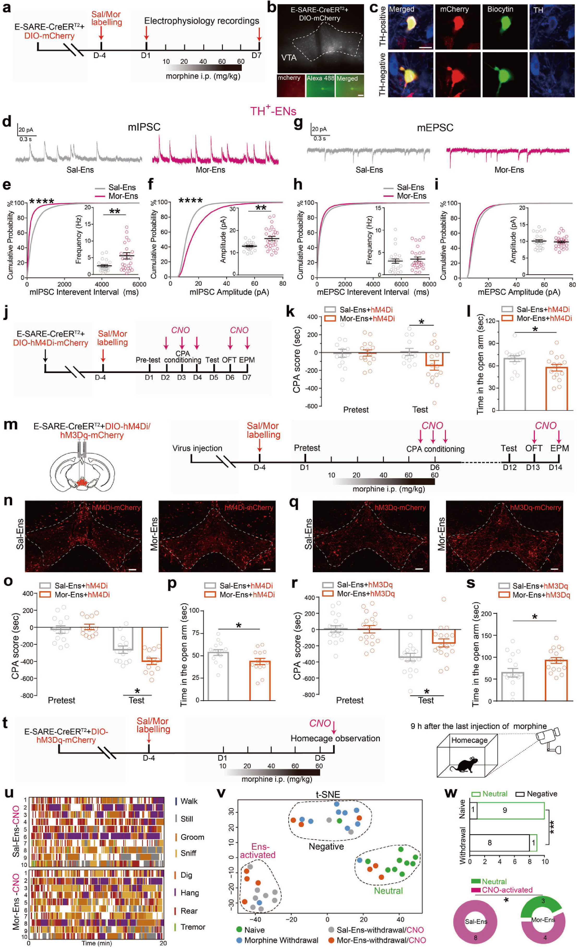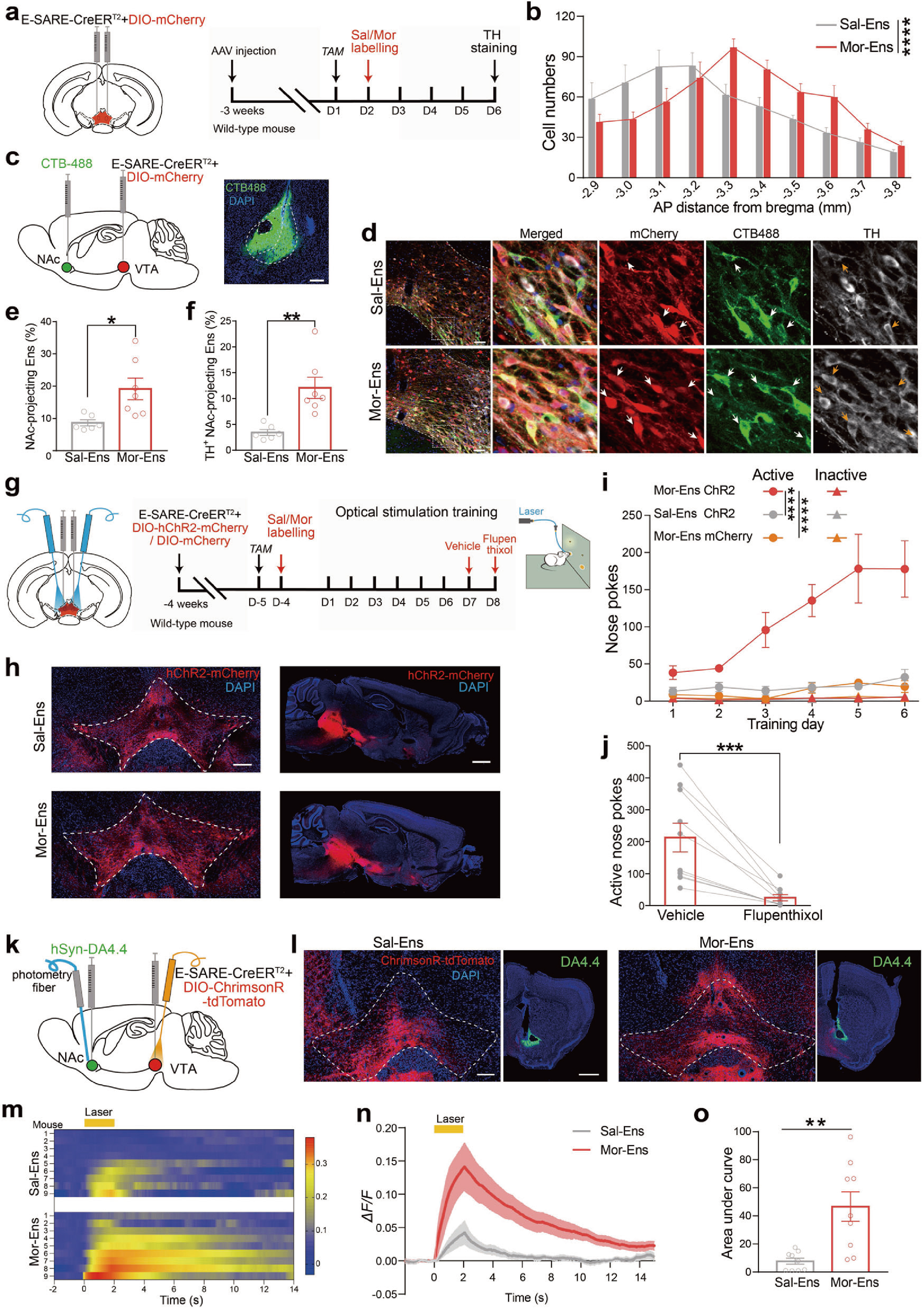 首先,研究人员借助响应神经元活性的功能元件--E-SARE(synaptic activity-response elements, AAV-E-SARE-CreERT2)标记中脑边缘系统的重要脑区腹侧被盖区(ventral tegmental area, VTA)吗啡初次暴露激活的神经元集群(Mor-Ens, 吗啡神经元集群),发现VTA吗啡神经元集群偏向性地投射到伏隔核(the nucleus accumbens, NAc)脑区(图1a-f)。