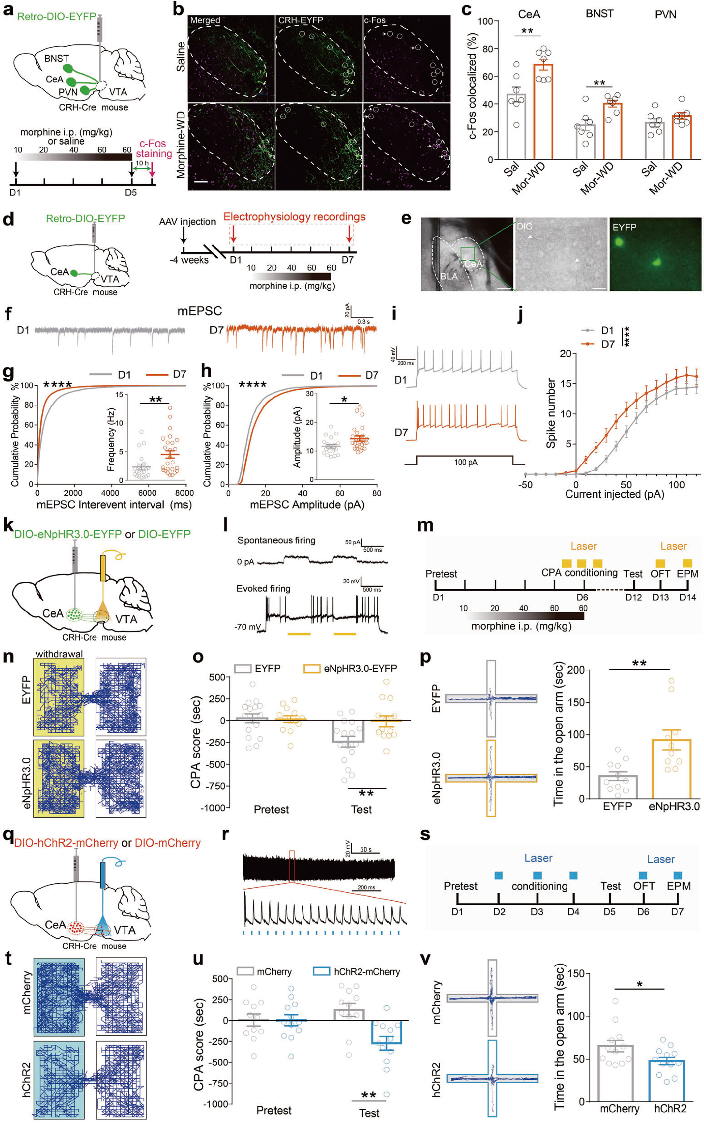 随后,研究人员在CRH-Cre鼠CeA区注射Cre依赖的光遗传学病毒,并在VTA埋入光纤,借助条件性位置厌恶(conditioned place aversion, CPA)、高架十字迷宫(elevated-plus maze, EPM)和旷场实验(open-field, OFT)行为学范式发现,AAV-DIO-eNpHR3.0抑制CRHCeA→VTA投射通路可缓解吗啡戒断诱发的焦虑和厌恶负面情绪(3k-p),AAV-DIO-hChR2激活CRHCeA→VTA投射通路可加重吗啡戒断诱发负性情绪(3q-v)。