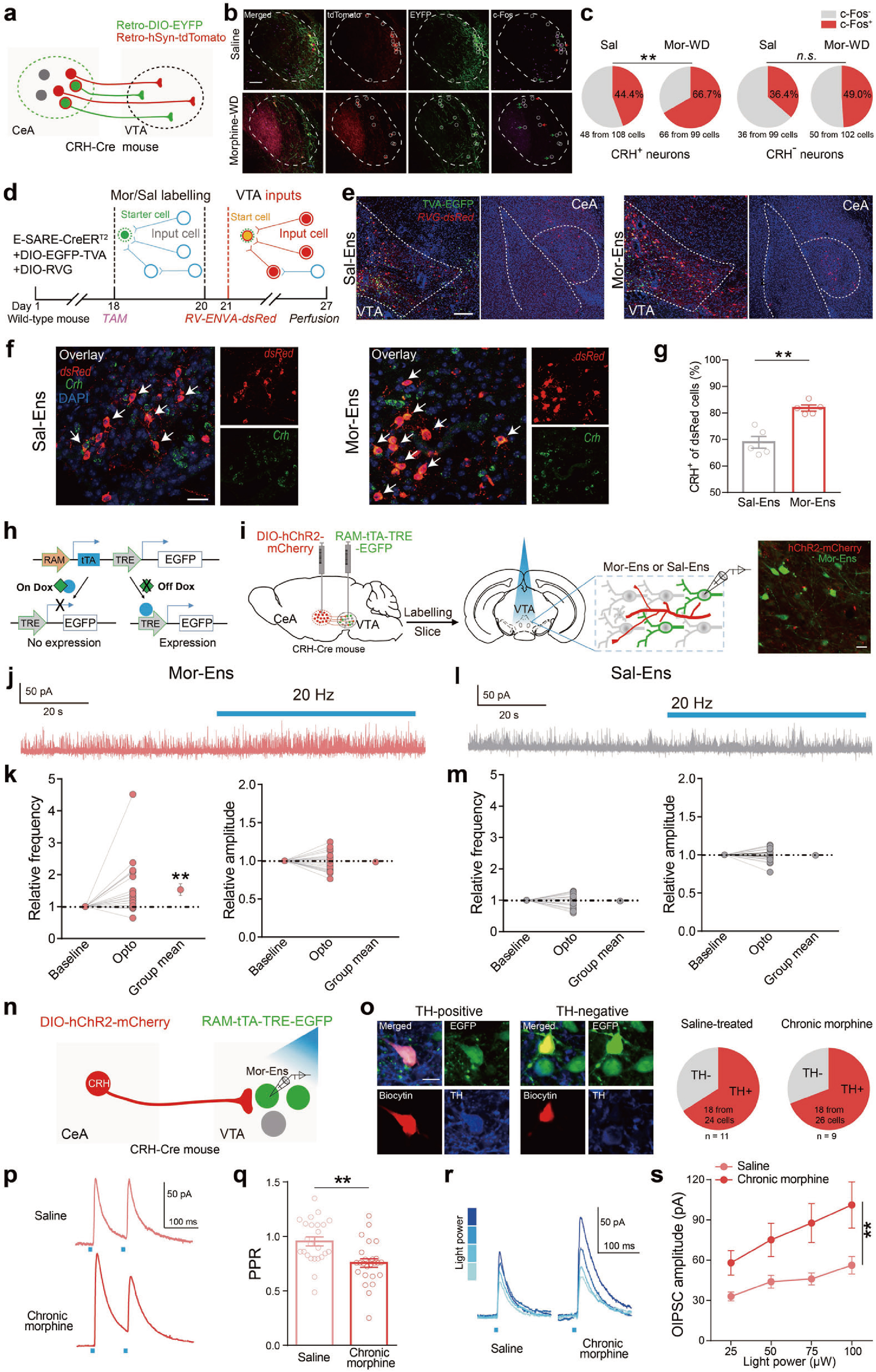 接下来,研究人员在CRH-Cre小鼠CeA注射AAV-DIO-hChR2-mCherry,VTA区注射AAV-RAM-tTA-TRE-EGFP,借助Dox标记体系和光遗传学技术发现,吗啡慢性给药促使CeA中CRH神经元向VTA多巴胺能吗啡神经元集群的抑制性连接增强(图4h-s)。
