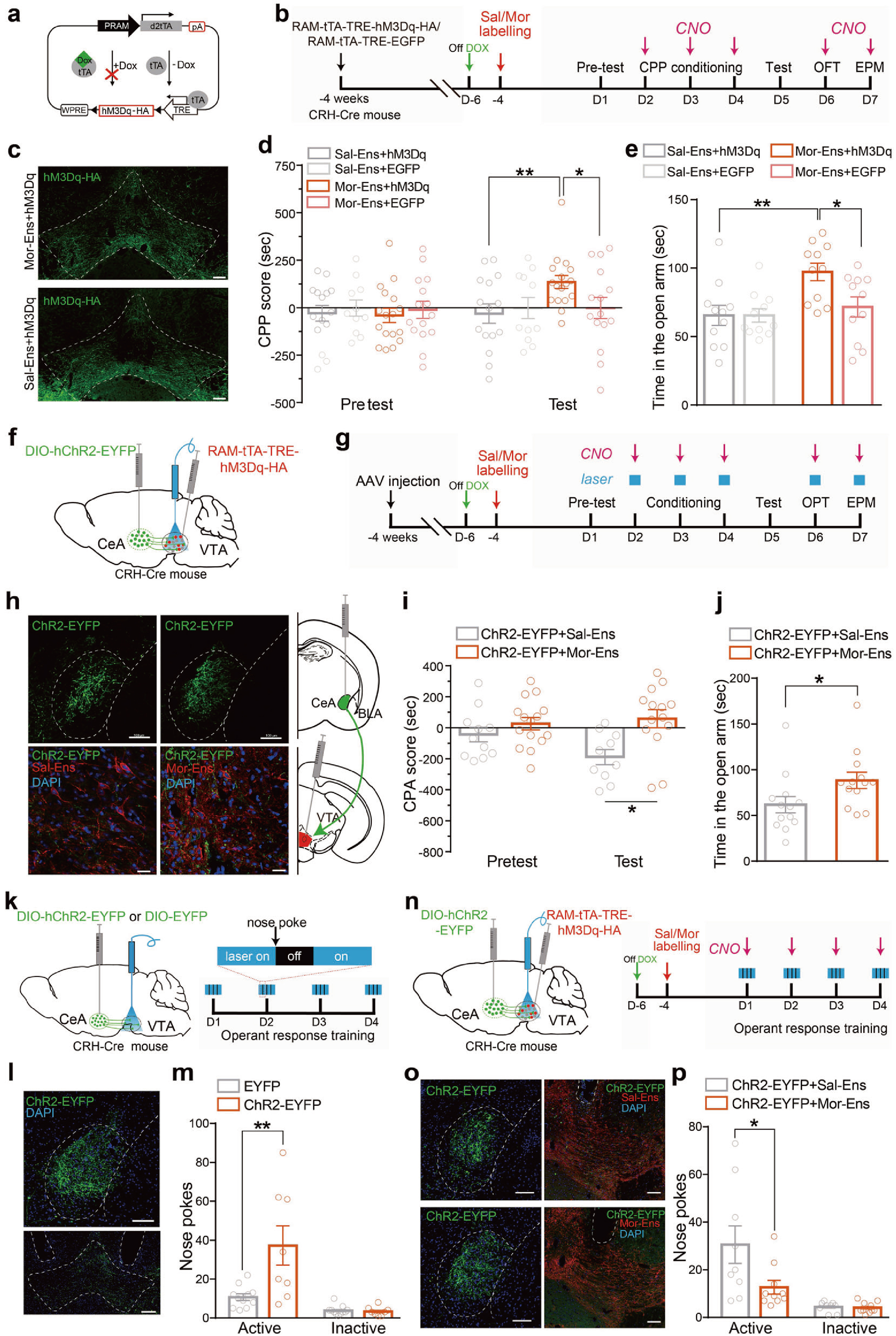 为观察VTA吗啡神经元集群的激活是否能缓解由CRHCeA→VTA连接增强引起负性情绪,研究人员在CRH-Cre小鼠CeA注射AAV-DIO-hChR2-EYFP,VTA注射AAV-RAM-tTA-TRE-hM3Dq病毒,借助CPA和EPM行为学范式发现,光遗传激活CRHCeA→VTA通路导致的小鼠表现出条件性位置厌恶,同时进入开放臂的次数减少,表现出焦虑样行为,而化学遗传激活VTA吗啡神经元集群则有效改善了这一现象(图5f-j)。