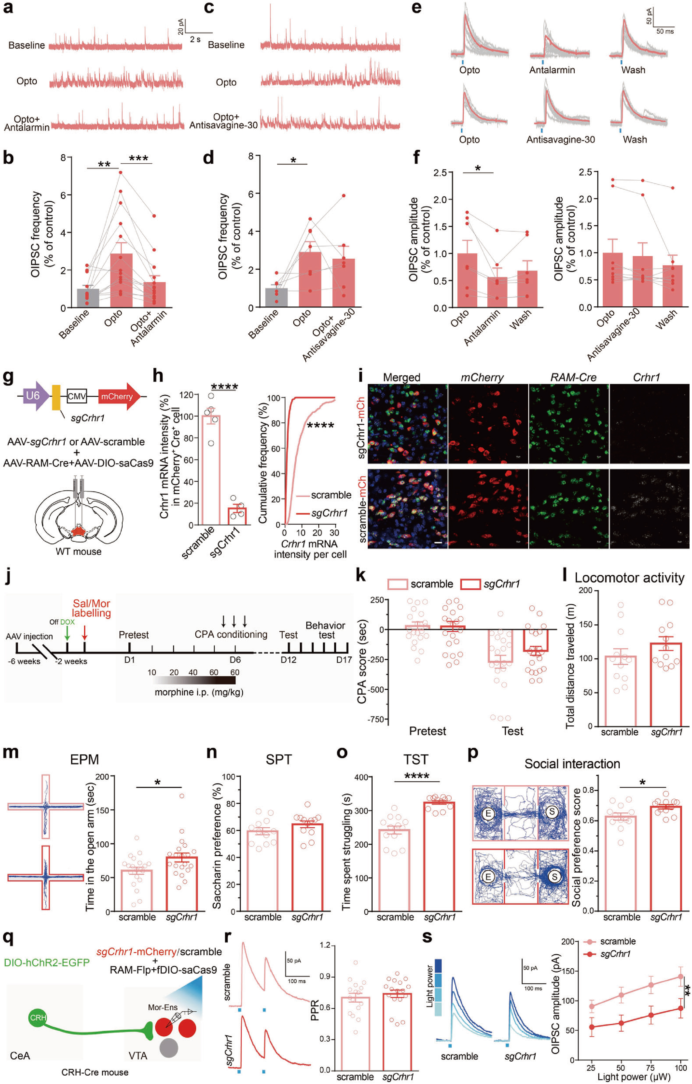 此外,在CRH-Cre小鼠注射光遗传病毒及RAM/DOX系统介导的CRISPR病毒发现,抑制吗啡神经元集群上的CRHR1受体显著降低O-IPSC振幅,提示了下调CRHR1受体的表达,能显著减弱CeA CRH神经元到VTA吗啡神经元集群的抑制性输入(图6q-s)。