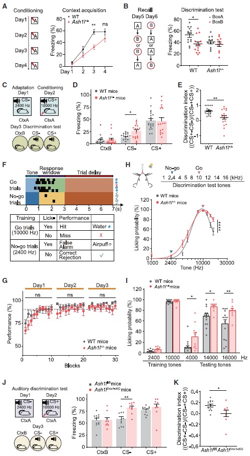 接下来,研究人员对Ash1l缺失小鼠的学习行为进行评估,借助条件性恐惧反射范式发现,Ash1l+/-小鼠和WT小鼠均学会了情境性恐惧条件反射,并表现出类似的恐惧记忆重提水平,然而Ash1l+/-小鼠在恐惧学习的第三天表现出木僵行为(freezing, 老鼠的一种防御反应)下降;此外,在Ash1l+/-小鼠中未观察到两种不同环境下的木僵行为差异(WT小鼠在context A中表现出较高的木僵行为,在context B(新环境)中表现出较低的木僵行为),提示了Ash1l+/-小鼠辨别能力受损(图2A,B)。