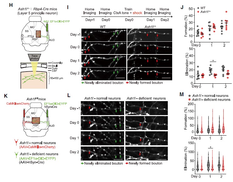 此外,作者还研究了在小鼠新皮层中活性依赖的突触消除,追踪了听觉皮层(auditory cortex, AUD)到后顶叶皮层(posterior parietal cortex, PTLp)长距离投射轴突的变化。研究人员将AAV-EF1a-DIO-EYFP注射在Rbp4-Cre小鼠AUD,特异性标记听觉皮层L5神经元(图3H)。小鼠接受音调依赖的恐惧条件训练,成像观察轴突变化发现,声调依赖的恐惧条件学习24h后,Ash1l+/-::Rbp4-Cre小鼠“bouton”(突触小结)的清除明显低于WT小鼠,而“bouton”形成则保持不变(图3H-J)。