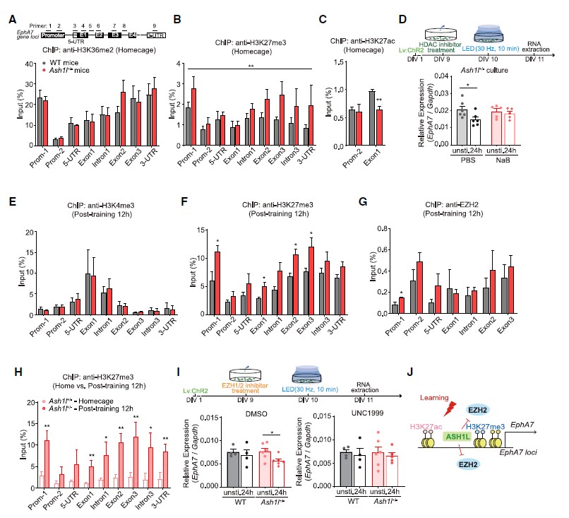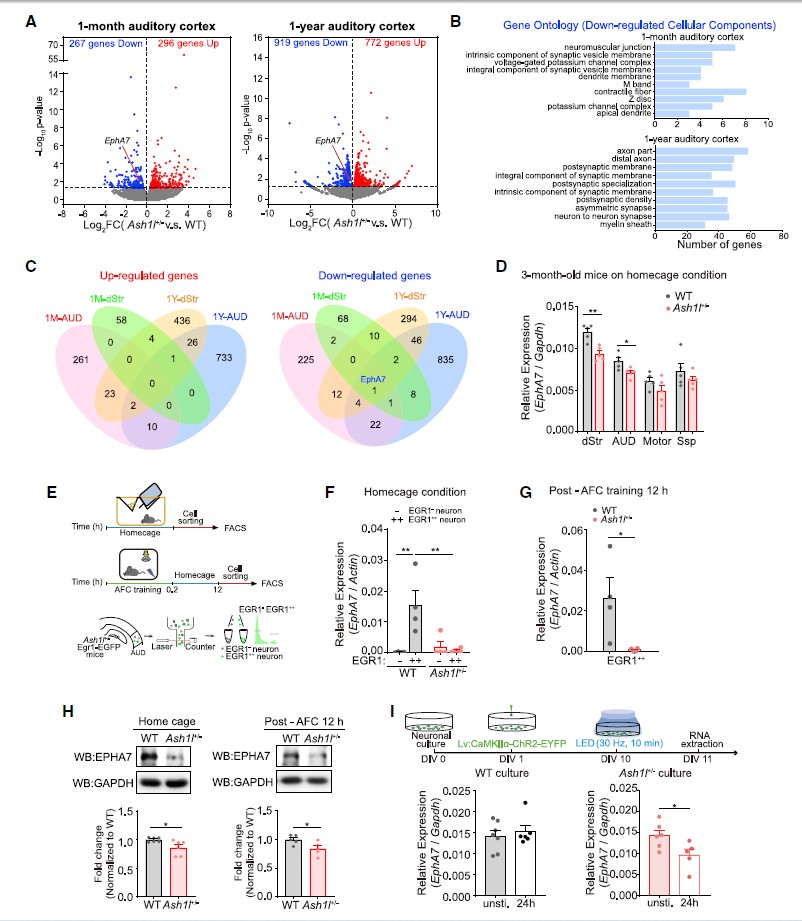 随后,研究人员借助音调依赖的恐惧条件行为学范式,在体内/体外均发现Ash1l+/-小鼠听觉皮层活动依赖的神经元中EphA7表达远低于WT小鼠的(图4D-I),提示了在Ash1l+/-小鼠中EphA7活动诱导表达受损。