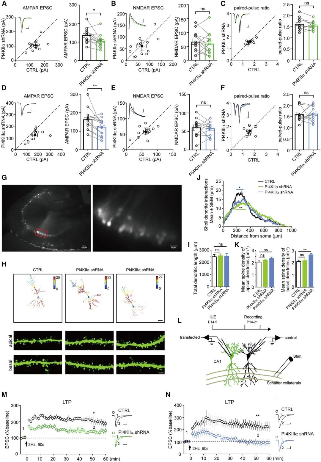 为了研究沉默PI4KIIa或PI4KIIIa是否会影响突触可塑性,研究人员首先在E14.5的小鼠胚胎中侧脑室注射PI4KIIa或PI4KIIIa的shRNA质粒,然后在P14-21之间制备了小鼠的急性脑切片并进行电生理记录。LTP分析显示,沉默PI4KIIIa不仅显著降低了LTP的幅度