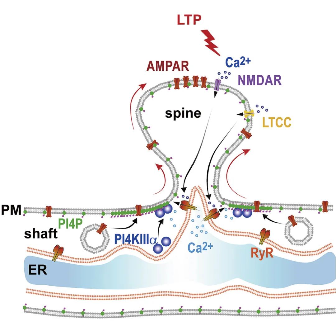 (钙诱导的钙释放)促进了PI4KIIIa在LTP期间从细胞质到细胞膜表面募集,进而介导了PI4P的合成,促进AMPAR亚基GluA1在细胞膜上的运输(图4)。