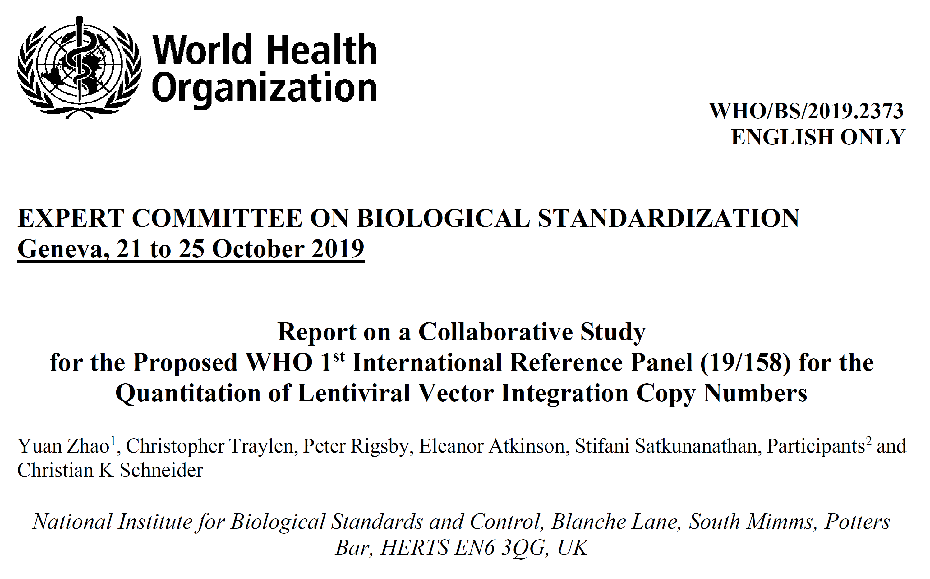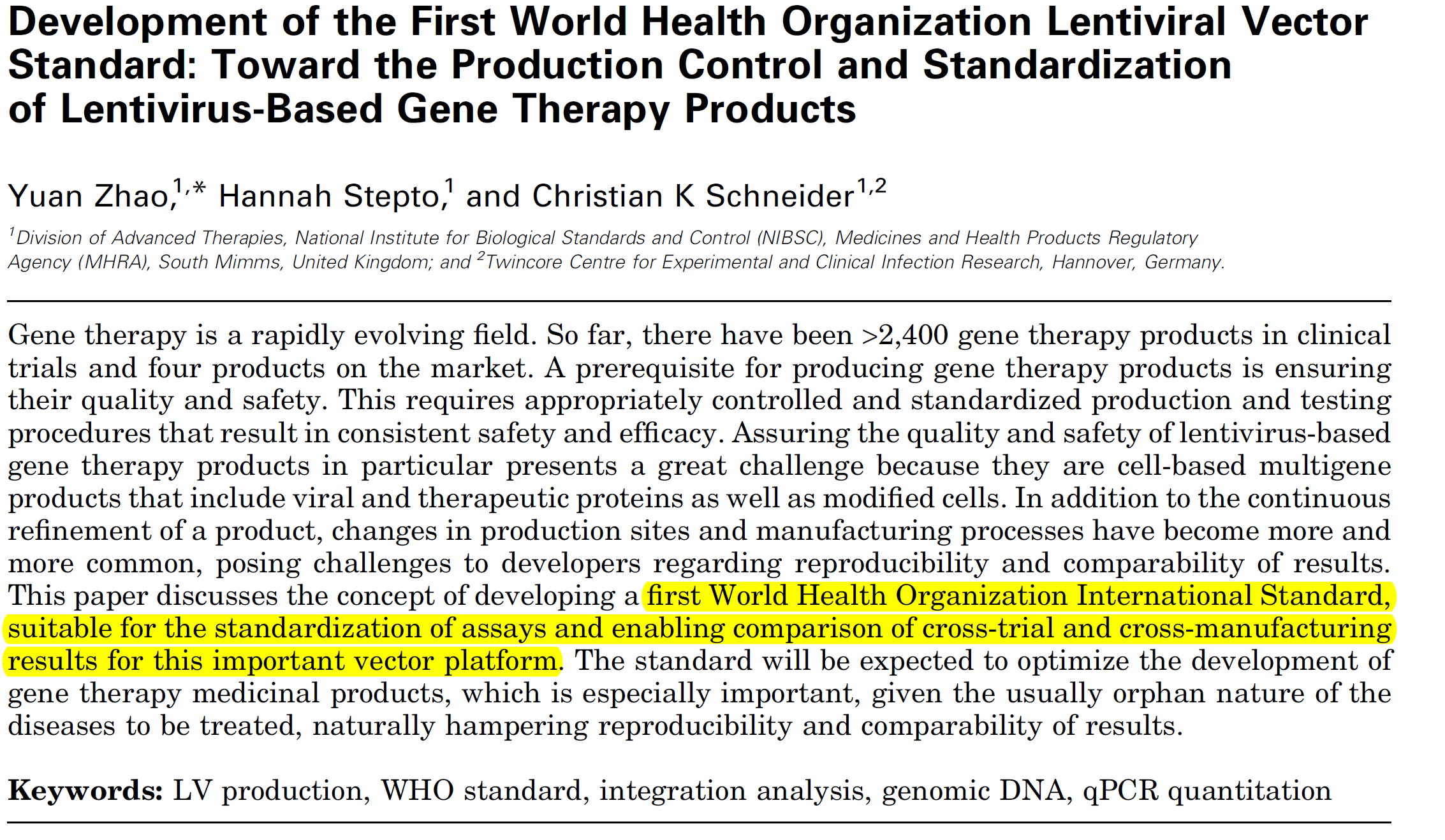 2017年起,WHO及国家生物标准与控制研究所(The National Institute for Biological Standards and Control,NIBSC)共同启动制定全球首个针对慢病毒的国际标准,并制备标准品,用于对实验的规范和实验间、生产厂商间产品质量的一致性改进。